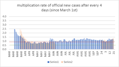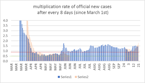 this means that there are 1.2 (1.5) times as many new reported cases as 4 (8) days before. | *this chart is explained below. | ||||||||||||||||||||||||||||||||||||||||||