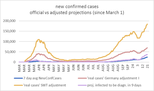 * -> However, while this is a value for todays confirmed cases, to be consistent with our conclusions above, we have to assume that, in the context of infections, this value refers to the situation 9 days ago. | |||||||||||||||||||||||||||||||||||||||||||