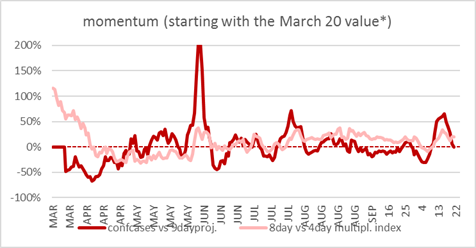 -> indicator: the difference of the 7 day average of official cases (column D) with the projected value 9 days ago signals the change of trajection. see momentum below | |||||||||||||||||||||||||||||||||||||||||||