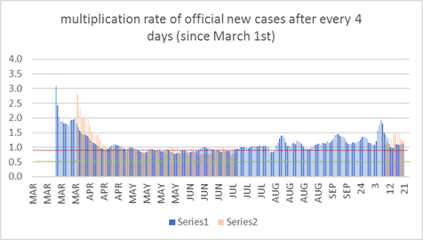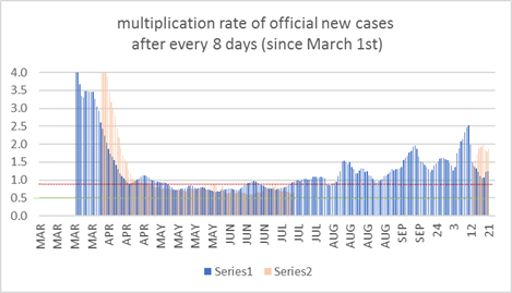 this means that there are 1.1 (1.2) times as many new reported cases as 4 (8) days before. | *this chart is explained below. | ||||||||||||||||||||||||||||||||||||||||||