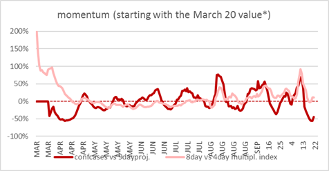 -> indicator: the difference of the 7 day average of official cases (column D) with the projected value 9 days ago signals the change of trajection. see momentum below | |||||||||||||||||||||||||||||||||||||||||||