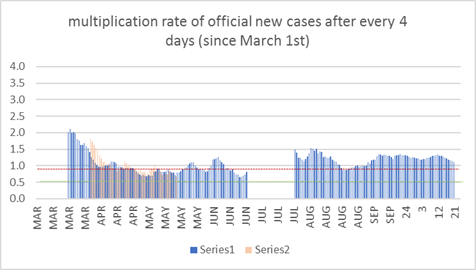 this means that there are 1.1 (1.4) times as many new reported cases as 4 (8) days before. | *this chart is explained below. | ||||||||||||||||||||||||||||||||||||||||||