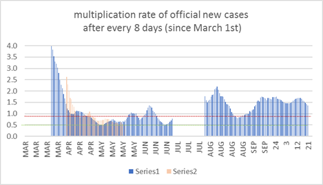 Now - if for example the time for infected people is 9 days until they become diagnosed (estimations), and consider the multiplication rate of the 7 day average in that span | |||||||||||||||||||||||||||||||||||||||||||