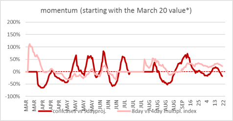 -> indicator: the difference of the 7 day average of official cases (column D) with the projected value 9 days ago signals the change of trajection. see momentum below | |||||||||||||||||||||||||||||||||||||||||||