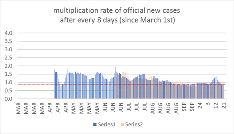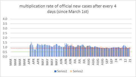 this means that there are 1 (0.9) times as many new reported cases as 4 (8) days before. | *this chart is explained below. | ||||||||||||||||||||||||||||||||||||||||||