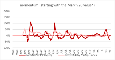 -> indicator: the difference of the 7 day average of official cases (column D) with the projected value 9 days ago signals the change of trajection. see momentum below | |||||||||||||||||||||||||||||||||||||||||||