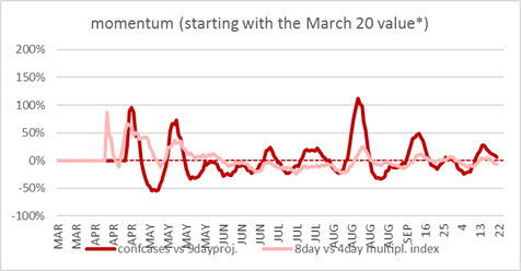 -> indicator: the difference of the 7 day average of official cases (column D) with the projected value 9 days ago signals the change of trajection. see momentum below | |||||||||||||||||||||||||||||||||||||||||||