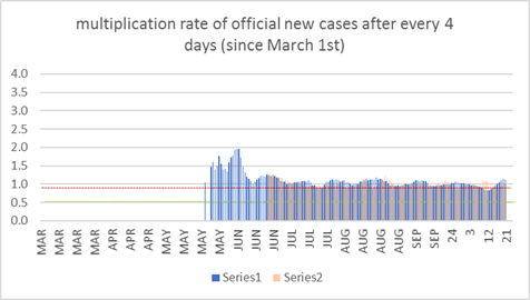 this means that there are 1.1 (1.1) times as many new reported cases as 4 (8) days before. | *this chart is explained below. | ||||||||||||||||||||||||||||||||||||||||||