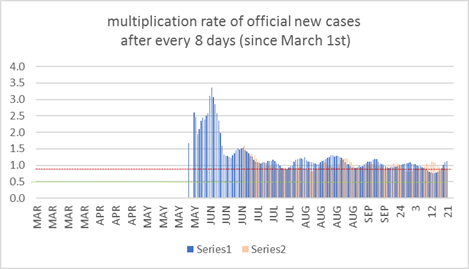 Now - if for example the time for infected people is 9 days until they become diagnosed (estimations), and consider the multiplication rate of the 7 day average in that span | |||||||||||||||||||||||||||||||||||||||||||