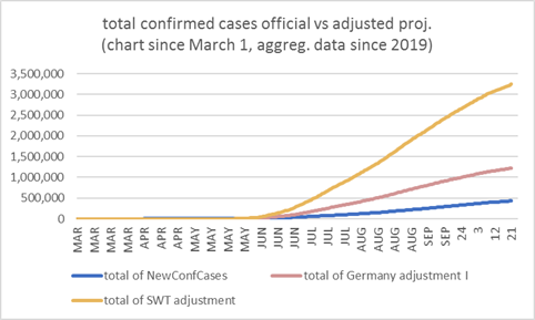 * -> However, while this is a value for todays confirmed cases, to be consistent with our conclusions above, we have to assume that, in the context of infections, this value refers to the situation 9 days ago. | |||||||||||||||||||||||||||||||||||||||||||
