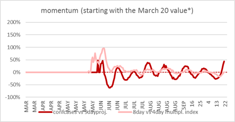 the pink line is calculated from the difference of the 8 day index and the 4 day index for confirmed cases. It is rather a slow lagging behind indicator and less sensitive to trend changes. | |||||||||||||||||||||||||||||||||||||||||||
