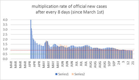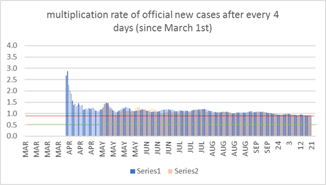 this means that there are 0.9 (0.8) times as many new reported cases as 4 (8) days before. | *this chart is explained below. | ||||||||||||||||||||||||||||||||||||||||||