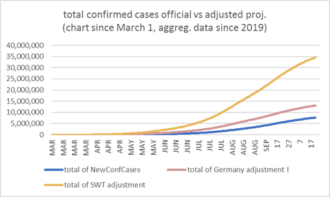 first a comparison of daily new cases as officially reported vs. daily new cases adjusted and normed to 1) the numbers of Germany as of March 31 and 2) the numbers of a collection of small wealthy and (hopefully) thoroughly testing countries (must read 'about' tab for explanation!) | |||||||||||||||||||||||||||||||||||||||||||