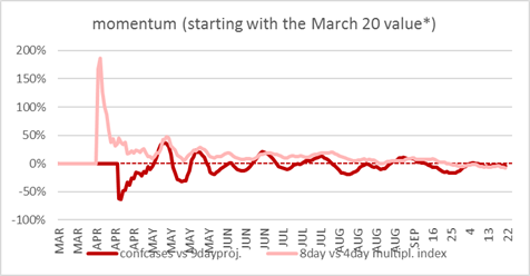 -> indicator: the difference of the 7 day average of official cases (column D) with the projected value 9 days ago signals the change of trajection. see momentum below | |||||||||||||||||||||||||||||||||||||||||||
