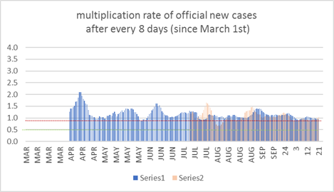 Now - if for example the time for infected people is 9 days until they become diagnosed (estimations), and consider the multiplication rate of the 7 day average in that span | |||||||||||||||||||||||||||||||||||||||||||