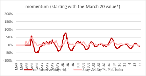 -> indicator: the difference of the 7 day average of official cases (column D) with the projected value 9 days ago signals the change of trajection. see momentum below | |||||||||||||||||||||||||||||||||||||||||||
