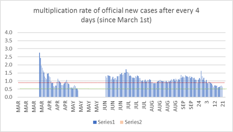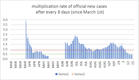 this means that there are 0.7 (0.4) times as many new reported cases as 4 (8) days before. | *this chart is explained below. | ||||||||||||||||||||||||||||||||||||||||||
