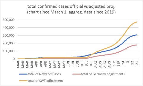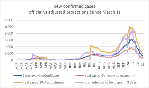 * -> However, while this is a value for todays confirmed cases, to be consistent with our conclusions above, we have to assume that, in the context of infections, this value refers to the situation 9 days ago. | |||||||||||||||||||||||||||||||||||||||||||