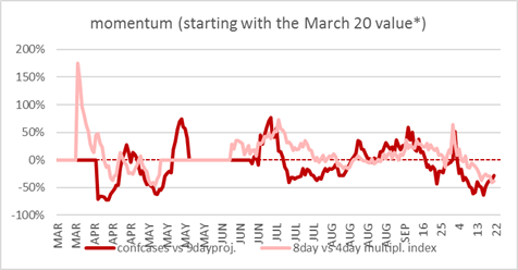 -> indicator: the difference of the 7 day average of official cases (column D) with the projected value 9 days ago signals the change of trajection. see momentum below | |||||||||||||||||||||||||||||||||||||||||||