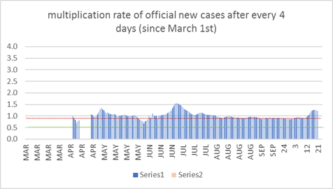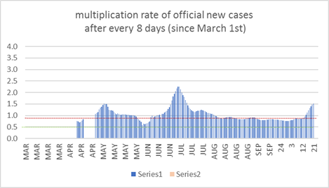 this means that there are 1.2 (1.5) times as many new reported cases as 4 (8) days before. | *this chart is explained below. | ||||||||||||||||||||||||||||||||||||||||||