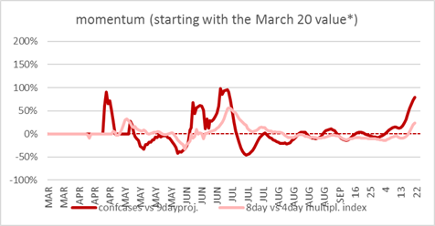 -> indicator: the difference of the 7 day average of official cases (column D) with the projected value 9 days ago signals the change of trajection. see momentum below | |||||||||||||||||||||||||||||||||||||||||||
