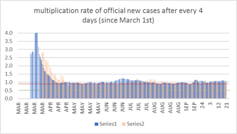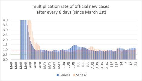 this means that there are 1.1 (1.2) times as many new reported cases as 4 (8) days before. | *this chart is explained below. | ||||||||||||||||||||||||||||||||||||||||||