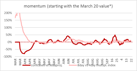 -> indicator: the difference of the 7 day average of official cases (column D) with the projected value 9 days ago signals the change of trajection. see momentum below | |||||||||||||||||||||||||||||||||||||||||||