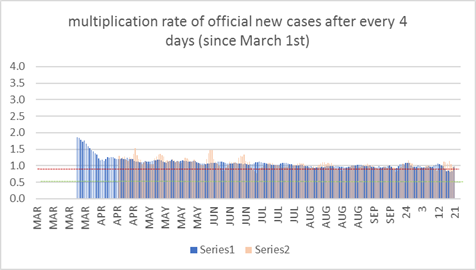 this means that there are 1 (0.8) times as many new reported cases as 4 (8) days before. | *this chart is explained below. | ||||||||||||||||||||||||||||||||||||||||||