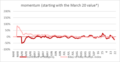 -> indicator: the difference of the 7 day average of official cases (column D) with the projected value 9 days ago signals the change of trajection. see momentum below | |||||||||||||||||||||||||||||||||||||||||||