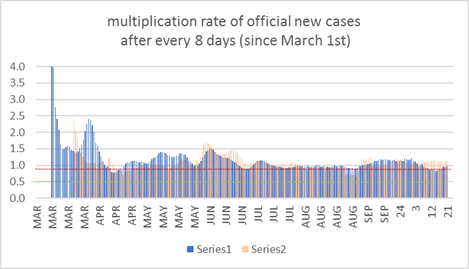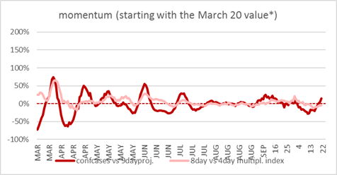 -> indicator: the difference of the 7 day average of official cases (column D) with the projected value 9 days ago signals the change of trajection. see momentum below | |||||||||||||||||||||||||||||||||||||||||||